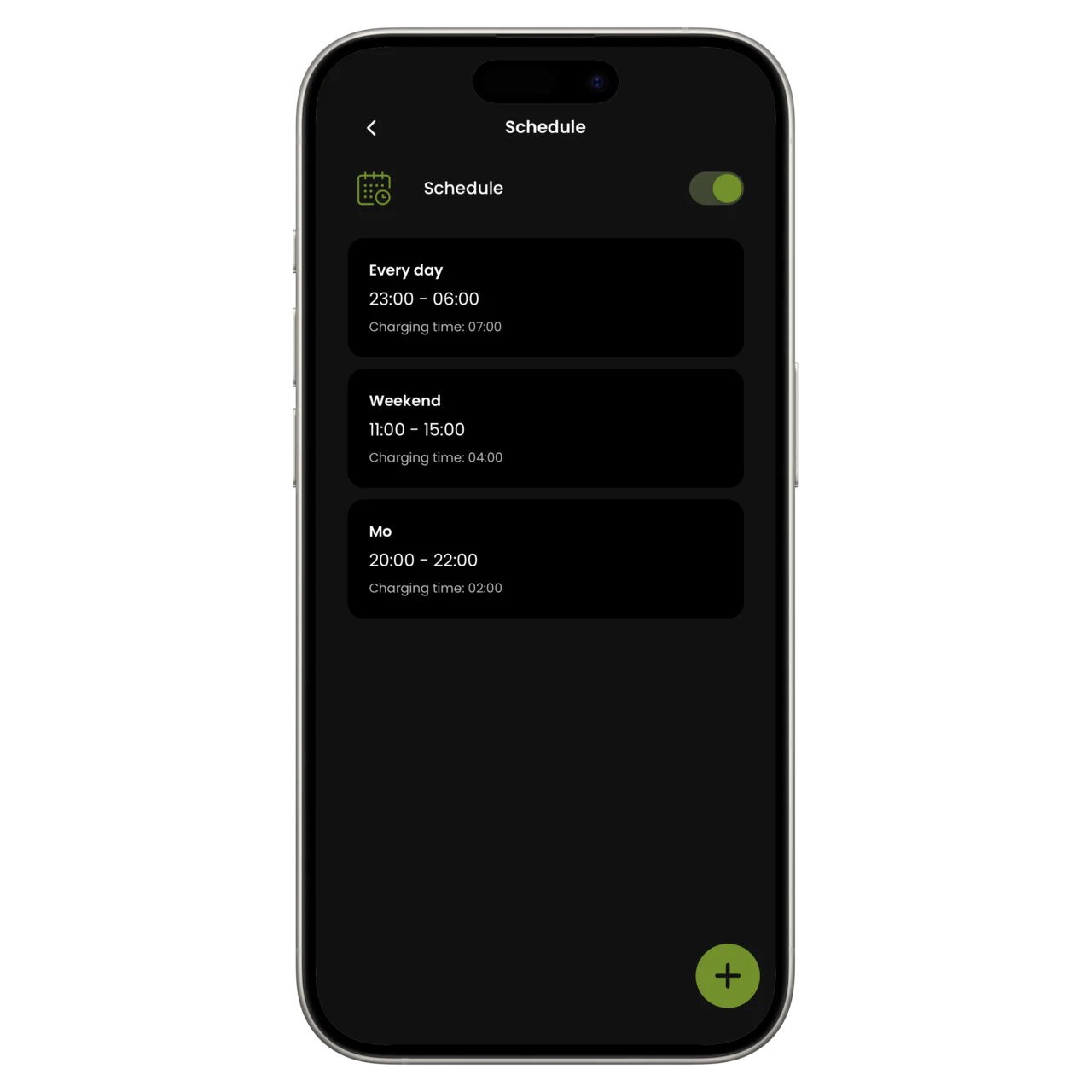 Laden Sie Ihr Auto nach einem festgelegten Zeitplan, z.B. während der günstigeren Tarifzeiten oder bei der Produktion von Energie aus Photovoltaikanlagen. Bestimmen Sie die für Sie passende Zeit: Tag oder sogar Stunde.