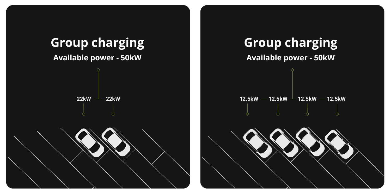 Group charging verwaltet die verfügbare Leistung und verteilt sie an die einzelne Geräte, die eine aktive Ladesession für die Fahrzeuge durchführen. Der Ladewert ändert sich mit der Anzahl der angeschlossenen Fahrzeuge.