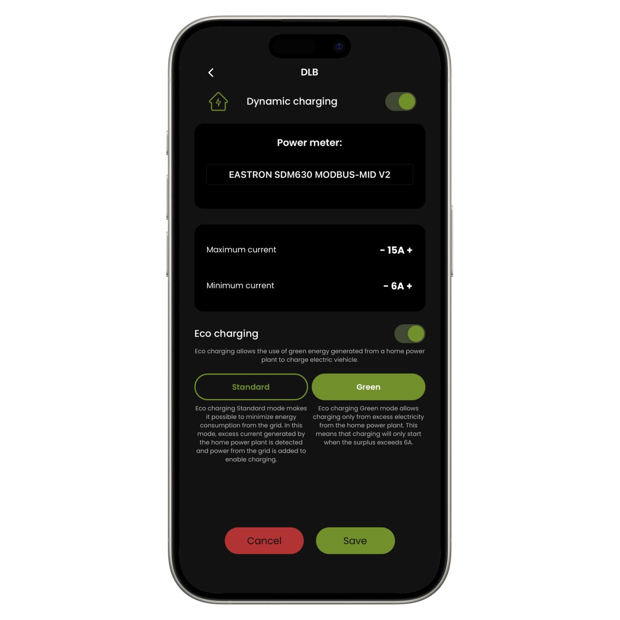 L'application mobile vous permet de configurer des modes de charge intelligents tels que la Gestion Dynamique de la puissance ou la Recharge ECO.