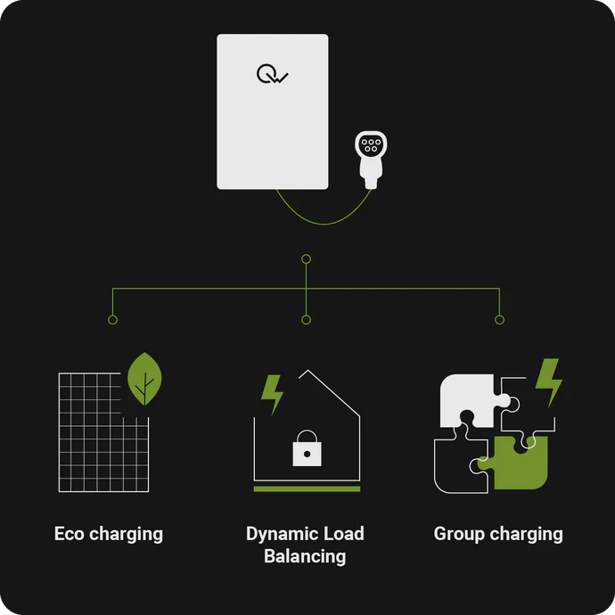 Unser Smart Charging System - eine Kombination aus Dynamic Charging Power Management und Group Charging - ermöglicht es, mehr Ladestationen in Mehrfamilienhäusern zu installieren, als es die derzeit verfügbare Leistung erlaubt, indem es die Verbrauchsparameter des gesamten Gebäudes überwacht und die verfügbare Leistung zum Laden der Autos nutzt. Intelligente Leistungsaufteilung verteilt die Ladeleistung gleichmäßig auf alle Ladestationen.