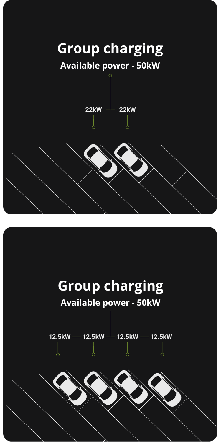 Group charging verwaltet die verfügbare Leistung und verteilt sie an die einzelne Geräte, die eine aktive Ladesession für die Fahrzeuge durchführen. Der Ladewert ändert sich mit der Anzahl der angeschlossenen Fahrzeuge.